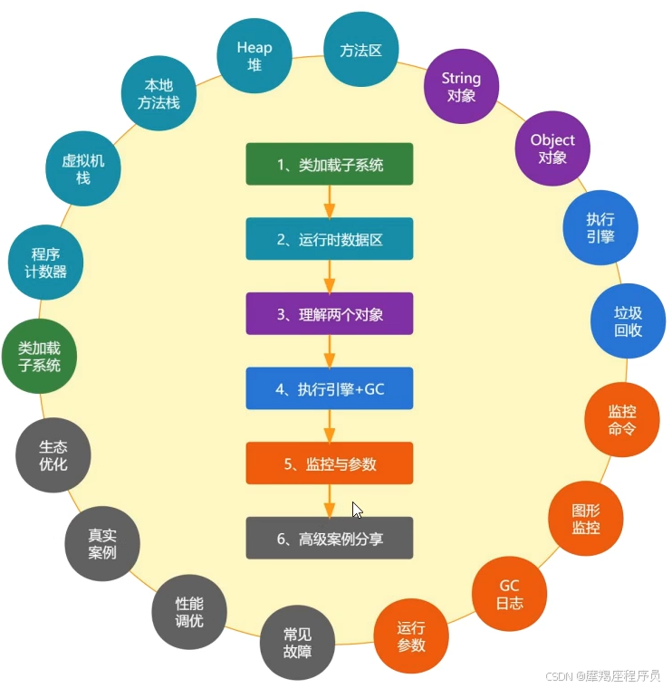 --->Object对象--->执行引擎--->垃圾回收--->监控命令--->图形监控--->GC日志--->运行参数