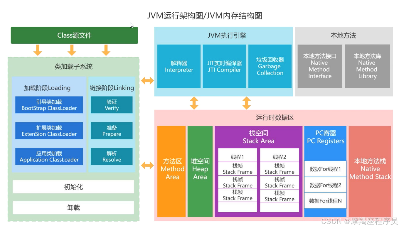 加载:通过类全名获取类二进制流,并将静态的存储结构,加载到运行时数据区中的方法区(生成class类对象),加载的来源常见有本地文件,网络流,压缩包,动态代理等等。