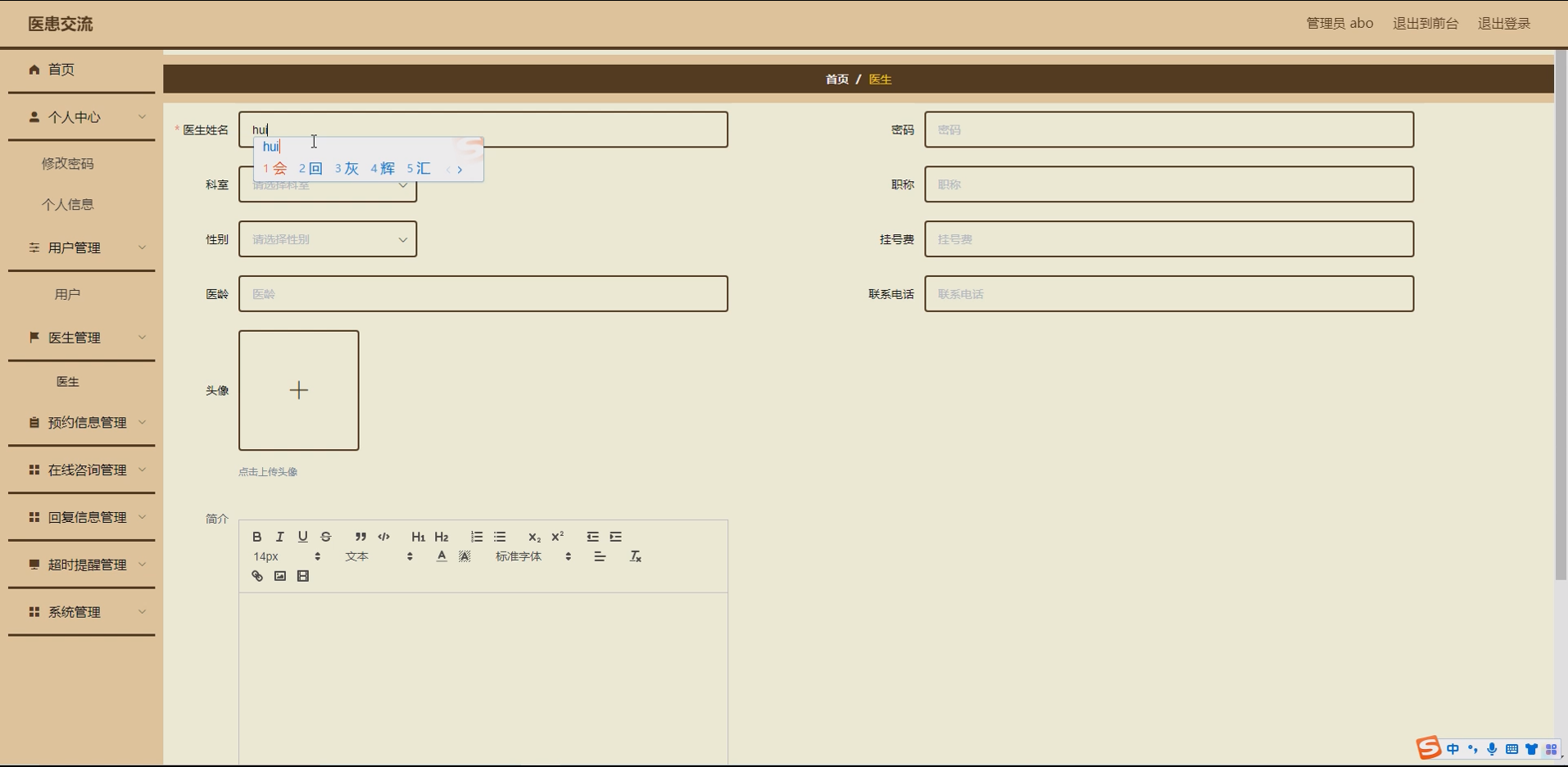 医生模块:实现医生注册、登录、个人信息(专业、擅长领域等)修改、查看个人预约列表、管理咨询信息等功能,便于医生高效对接患者;