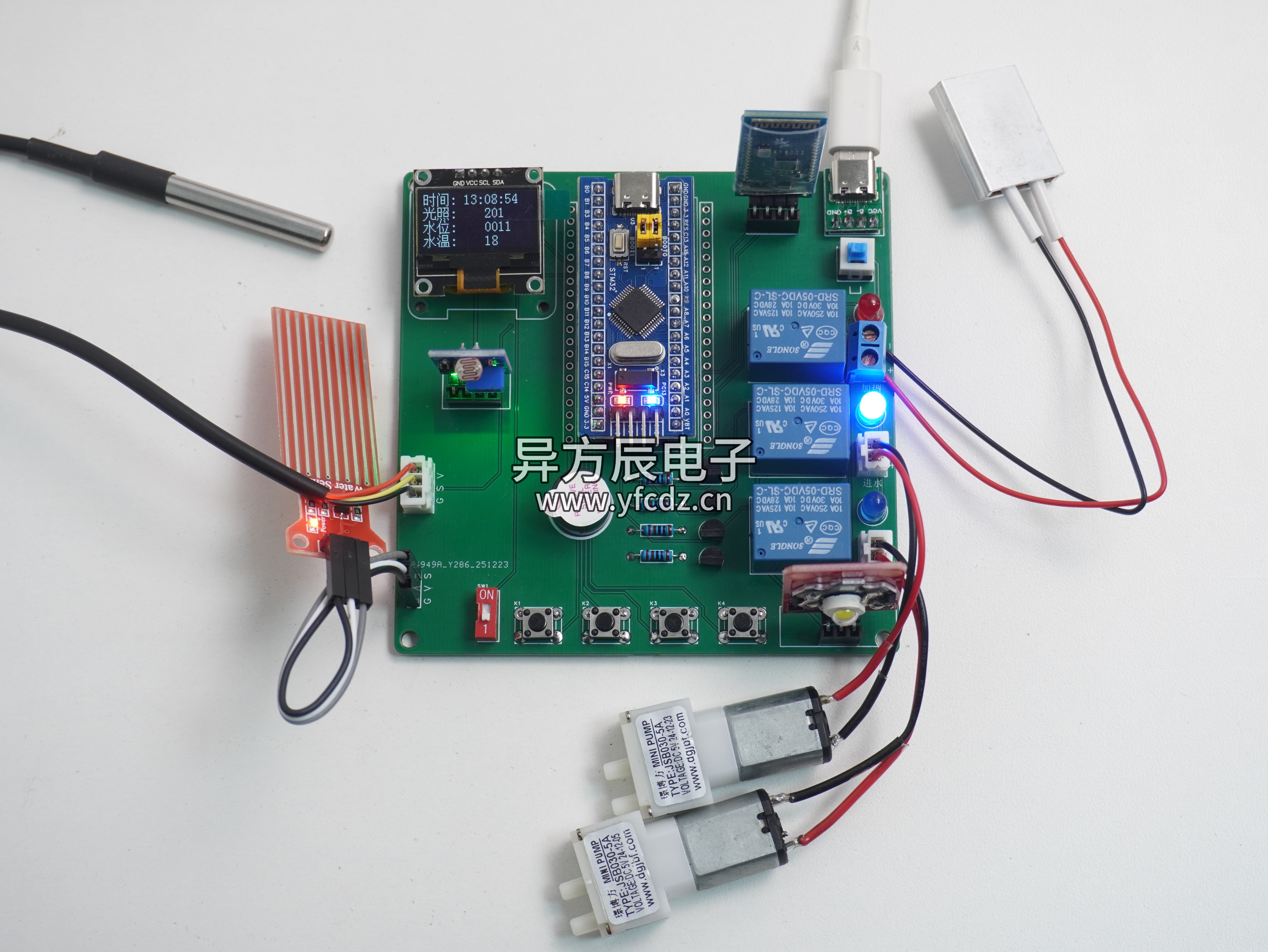- 阈值调节:可通过按键设置当前时间、温度上限、温度下限、光照阈值、水位上限、水位下限、定时开始时间和结束时间