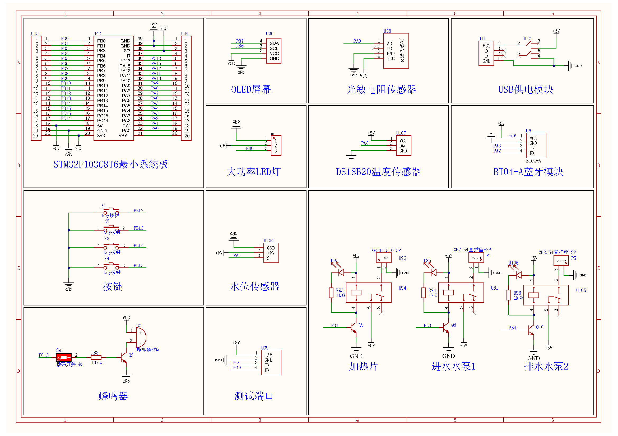 - 自动模式:当前时间处于定时工作时间内:光照小于光照阈值时开启照明灯,水位小于最低水位时开启进水水泵加水且此时蜂鸣器报警提醒;水位超过最大水位时开启排水水泵放水;温度低于最低温度时蜂鸣器报警并开启加热片加热水直到温度达到最高温度时停止加热; 当水位过低时加热功能不启动;当时间处于定时时间外则热水器不自动工作,只能通过手动模式控制。