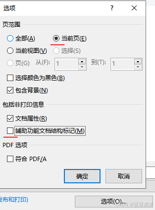4. 点击 导出 ,创建PDF ,点击 选项 ,选择 当前页 ,然后下面 辅助功能文档结构标记 那一行 取消勾选,之后点击确定就可以了