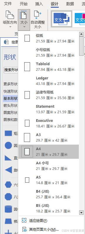 1. 点击 设计 ,再点击 大小 ,选择 适应绘图