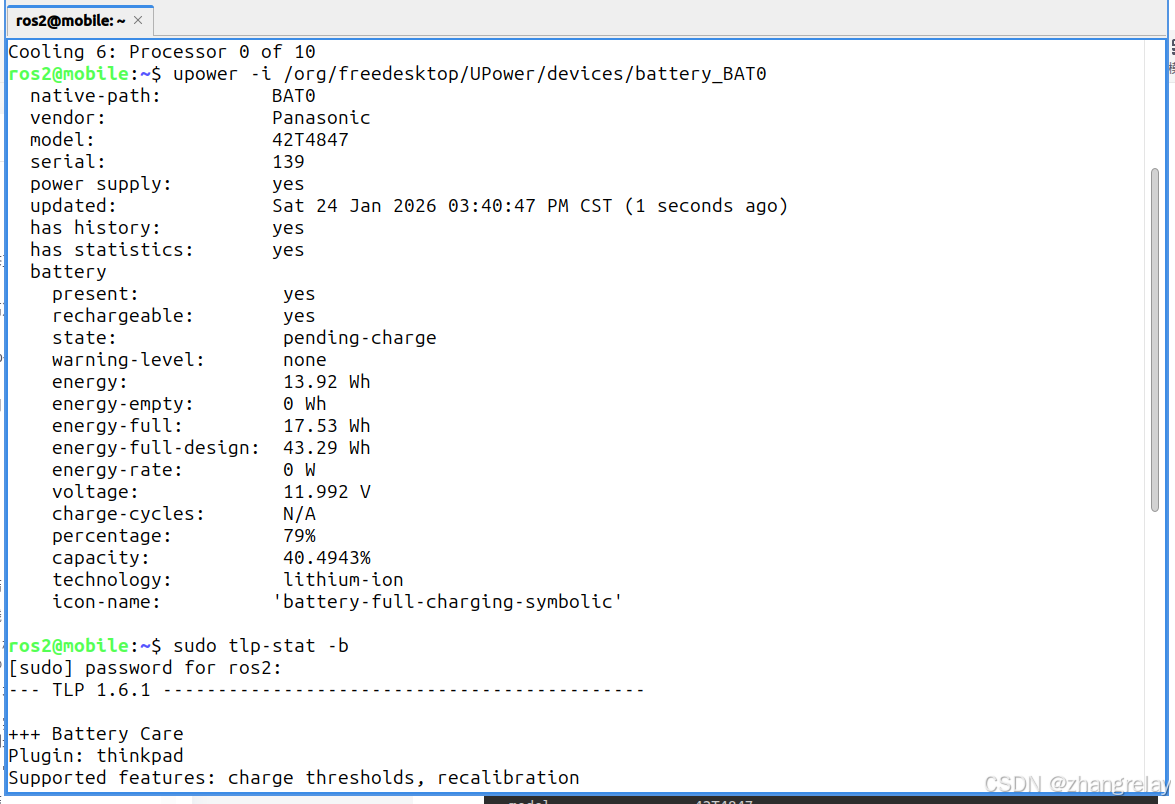 tlp-stat 会整合 sysfs 数据,并补充阈值配置、驱动状态等信息,适合 ThinkPad 等支持高级电池管理的机型: