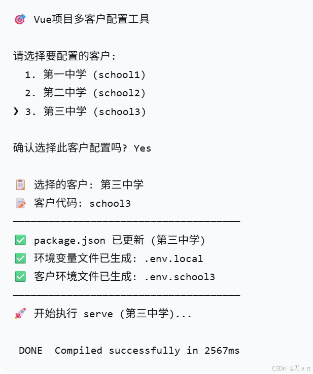 在开发一个需要为多个学校/客户提供定制化界面的Vue项目时,每个客户都需要不同的标题、Logo、主题色等配置。传统的方式是通过环境变量手动切换,但操作繁琐且容易出错。为此,设计了一套自动化配置方案,实现了"一键切换客户配置"的功能。