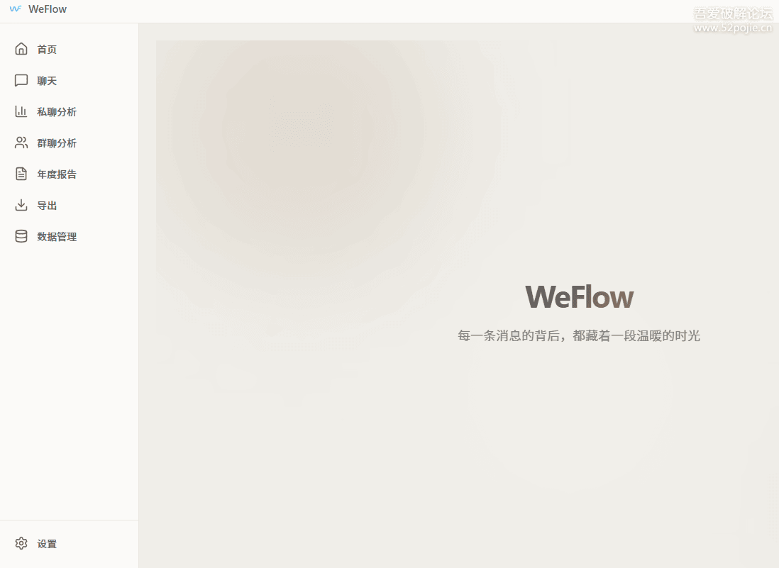 Windows\] WeFlow v1.3.1-V信聊天记录浏览、导出 链接:[https://pan.xunlei.com/s/VOjjSHnQE113HfSiAWrpMIqMA1?pwd=zzga#](https://pan.xunlei.com/s/VOjjSHnQE113HfSiAWrpMIqMA1?pwd=zzga# "https://pan.xunlei.com/s/VOjjSHnQE113HfSiAWrpMIqMA1?pwd=zzga#")  WeFlow 是一个完全本地的V信实时聊天记录查看、分析与导出工具。它可以实时获取你的V信聊天记录并将其导出,还可以根据你的聊天记录为你生成独一无二的分析报告。安装时按照指引一步步操作即可 主要功能: 本地实时查看聊天记录 统计分析与群聊画像 年度报告与可视化概览 导出聊天记录为 HTML 等格式 本地解密与数据库管理 提醒:本工具仅适配V信 4.0 及以上版本,请确保你的V信版本符合要求