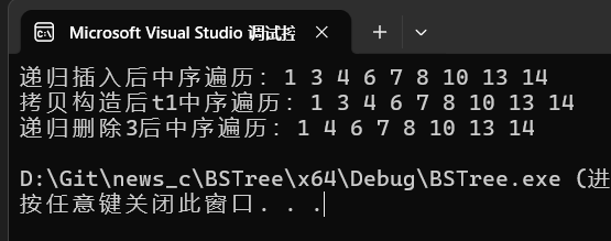 cout << "递归插入后中序遍历:";