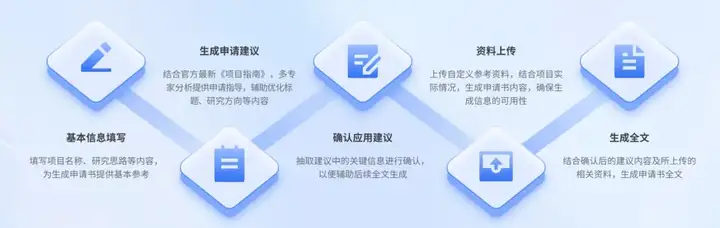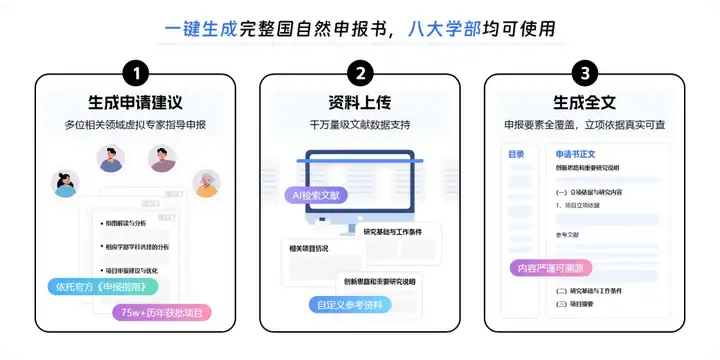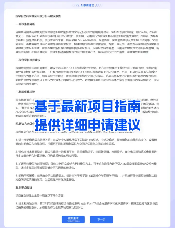 - 只需输入基本信息和研究思路,系统就能生成科学可行的申请建议,还支持两次重新生成优化;