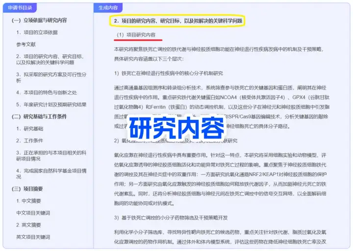 **▸ 针对研究内容:**生成的方案会参考同领域成功项目的逻辑框架与表达,使您的"核心假说→关键技术→逻辑闭环"既符合评审习惯,又具备扎实的学术可信度。