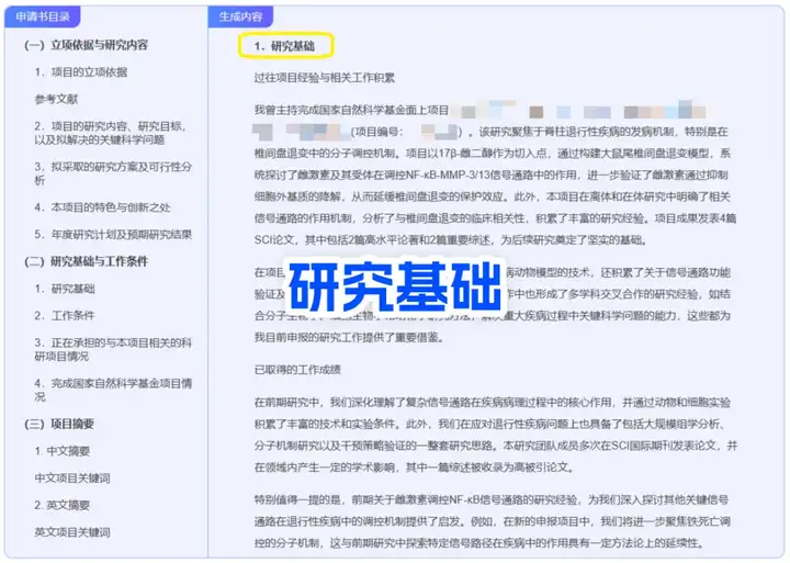 - 生成的全文会自动梳理**"科学问题→研究方案→前期基础"的逻辑链条**,帮你避开"逻辑混乱、主线模糊"的常见误区,这都是基于多年行业经验的沉淀,普通AI根本无法复制。
