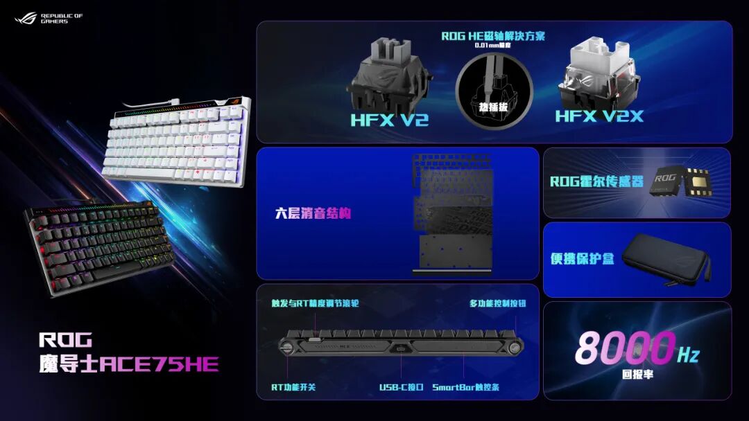魔导士Ace 75 HE磁轴键盘采用75%布局,搭载ROG HFX V2以及V2X磁轴搭配ROG霍尔传感器,可实现0.01mm精度,磁通量容错能力更强。键盘支持热插拔,可选择适配磁轴自行替换;回报率高达8000 Hz,操作响应更快更跟手。