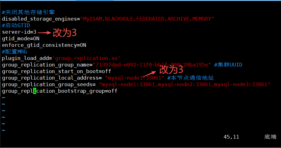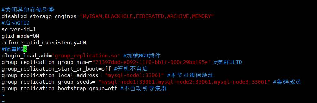 group_replication_group_name="71397dad-e092-11f0-bb1f-000c29ba195e" #集群UUID