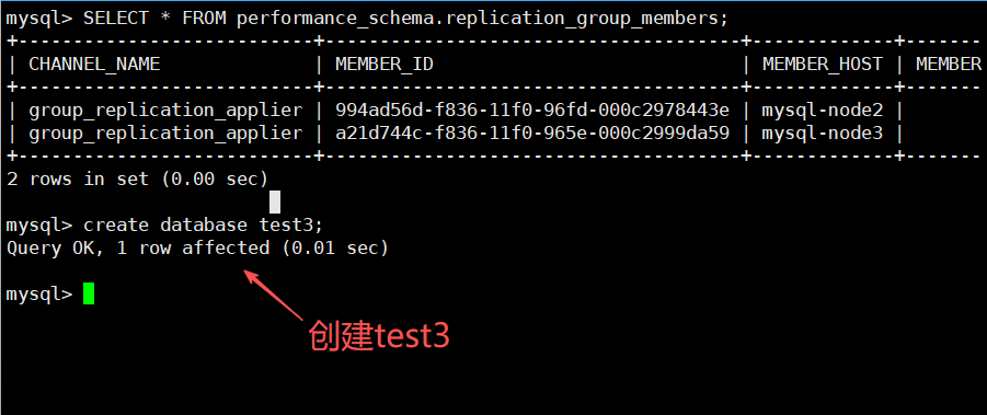 10.2.3使用mysql-node2创建数据库test3后再将mysql-node1加入集群