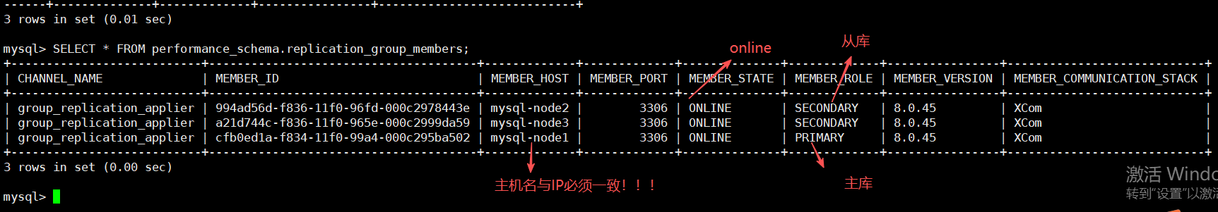 7.4.4查看集群成员状态-performance_schema库下replication_group_members表