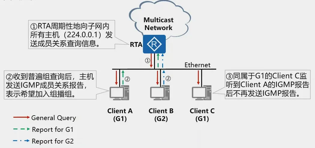 - CientA上的Timer-G1首先超时,向该网段发送目的地址为G1的成员报告报文.CientB上Timer-G2超时,向该网段发送成员报告报文,目的地址为G2。