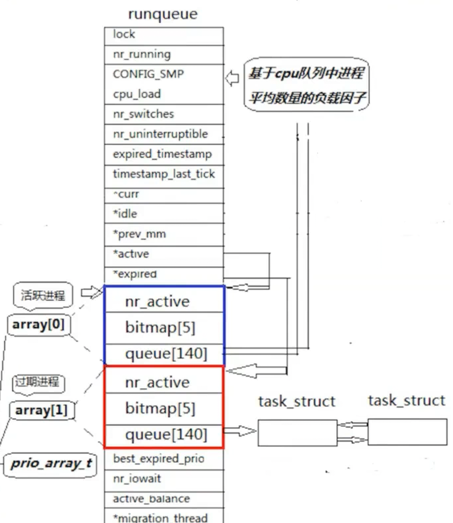 在进程的简要介绍中讲到一个cpu对应一个调度队列,调度队列本身是一个结构体,下面大致将以下调度队列的原理。如图: