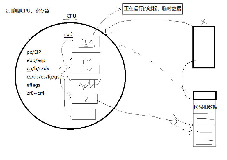 在cpu处理进程的过程中,cpu中有许多寄存器。这些寄存器都会存储进程中的临时数据。当这个正在执行的进程到cpu的使用时间之后,这些寄存器中的数据就会拷贝给这个进程。当下一次轮到这个进程时,该进程的数据会重新给寄存器,寄存器通过读取数据,就会知道上次进程运行到了什么地方,以及运行的结果是什么。并且cpu会沿着上次的进行向下运行依次往复。这个过程就叫做进程的切换。如下图: