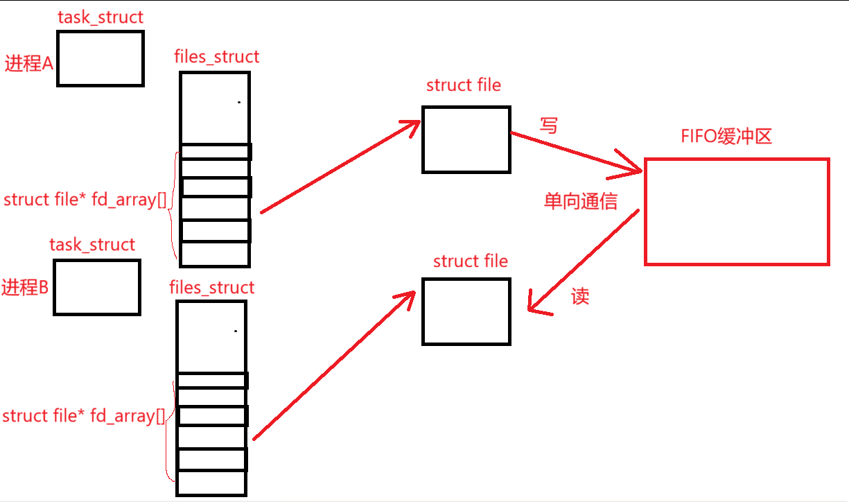 当进程调用mkfifo()系统调用时,内核会在文件系统中创建一个特殊类型文件(FIFO文件)。不同进程通过相同的路径名 打开这个FIFO文件时,内核会执行关键的打开同步:以只读方式打开的进程会阻塞,直到有进程以只写方式打开同一FIFO(反之亦然)。一旦读写配对成功,内核即为这些进程分配共享的管道缓冲区,所有进程的文件描述符都指向这同一个内核缓冲区,因此不同进程都能通过各自的文件描述符访问到同一份共享资源,从而实现进程间通信