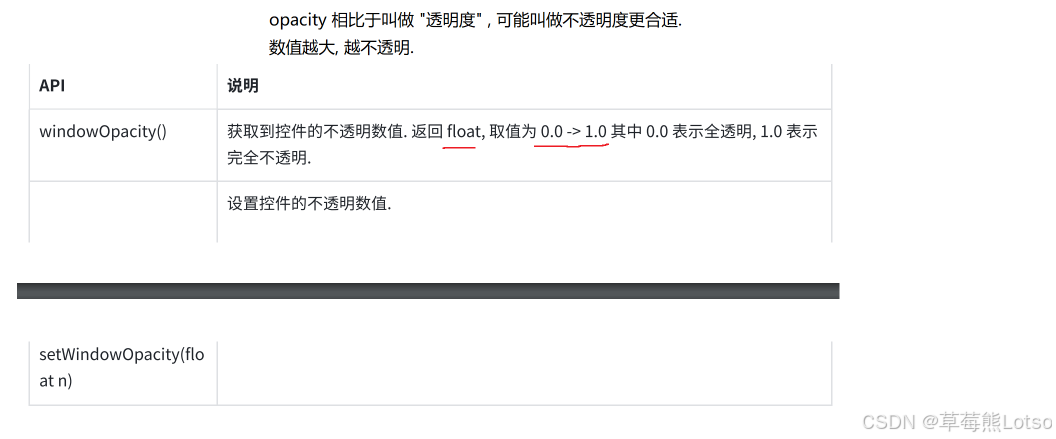 widowOpacity():获取当前透明度(返回float类型);setWindowOpacity(float value):设置不透明度(值越接近0越透明)。