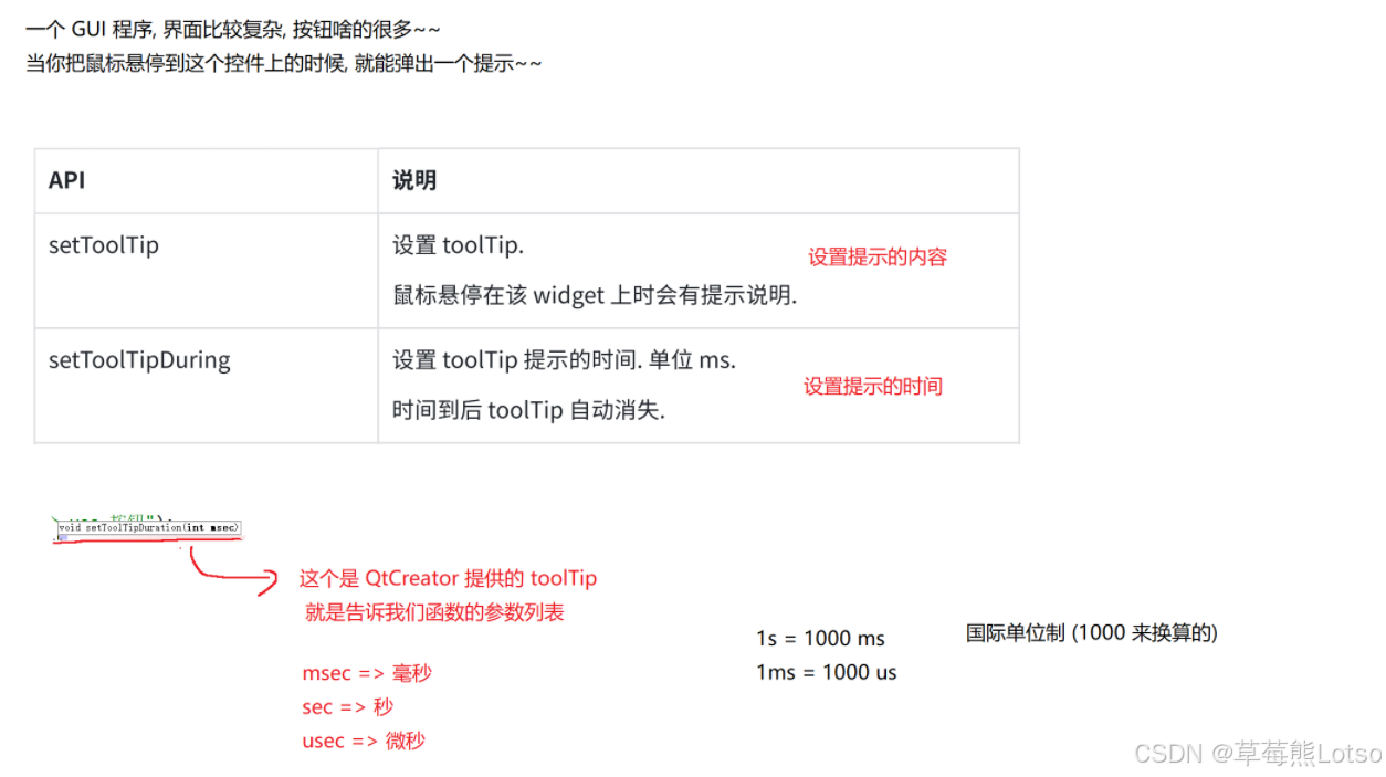 setToolTip(const QString& text):设置提示文本;setToolTipDuration(int ms):设置提示显示时长(单位为毫秒,默认自动消失)。