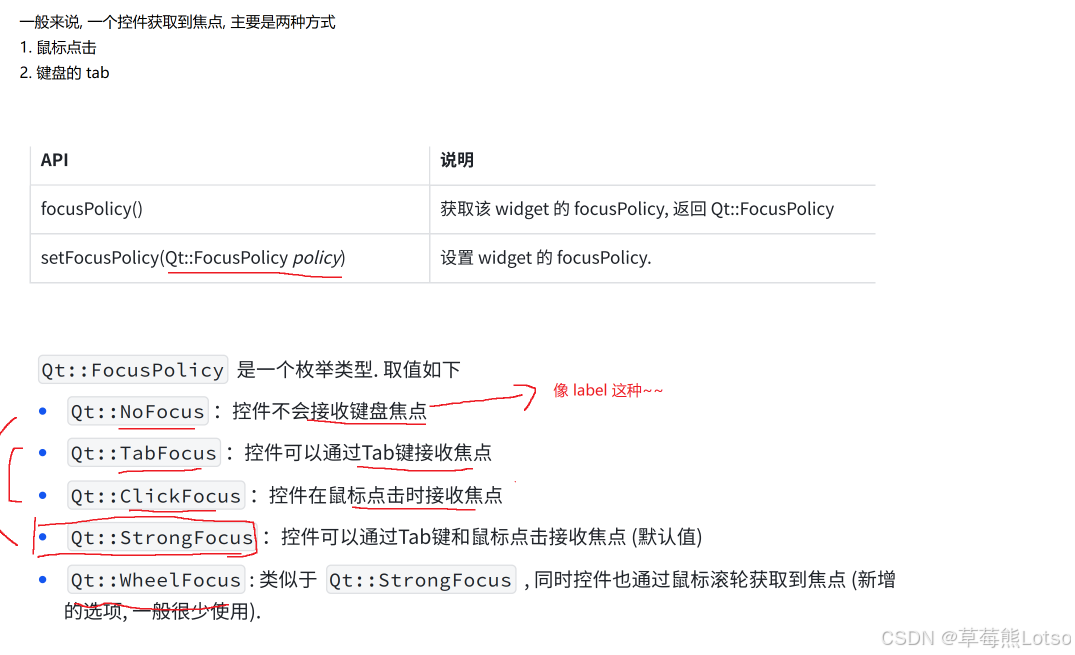 focusPolicy 控制控件如何获取焦点(焦点即当前接收键盘输入的控件),适用于输入框、按钮等需要键盘交互的场景。