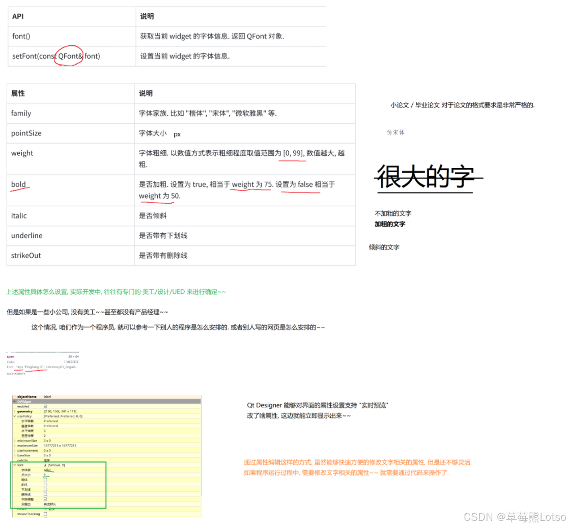 setFamily(const QString& family):设置字体(如 "微软雅黑""仿宋");setPointSize(int size):设置字体大小(单位为磅);setBold(bool flag):是否加粗(true 为加粗);setItalic(bool flag):是否倾斜(true 为倾斜);setUnderline(bool flag):是否添加下划线;setStrikeOut(bool flag):是否添加删除线。
