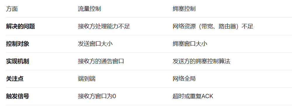 我们可以举个简单的例子,如果网络是一条高速公路,那么流量控制 关心的是接收方停车场的容量,解决的是点对点的问题(发送方与接收方之间),可以通过通过TCP首部中的窗口字段来实现;而拥塞控制关心的是整条高速公路的拥堵情况,解决的是全局性的问题(整个网络的拥塞),通过拥塞窗口和算法来实现。