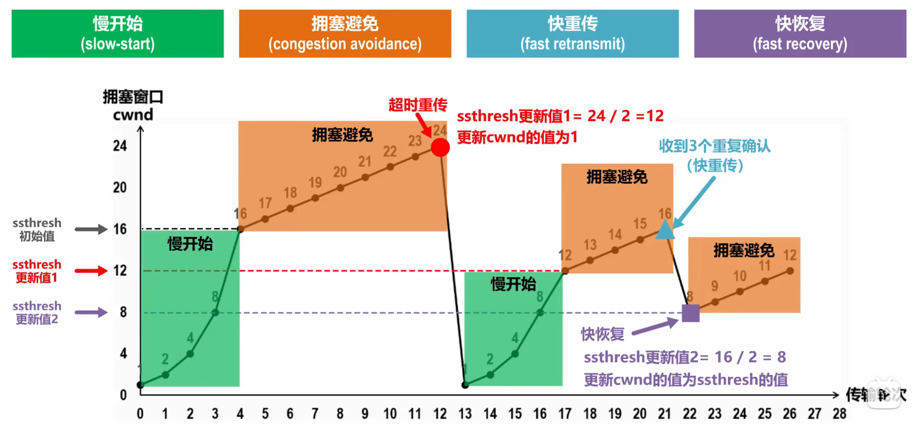 超时重传:完全没回应,窗口直接回到1,重新慢启动,就像:"完全堵死了!回到起点慢慢来(慢开始)"
