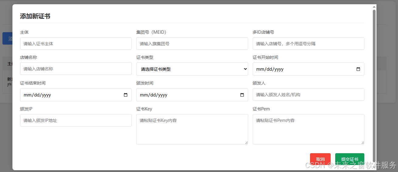 代码适配:根据业务需求修改表单字段(如新增"证书绑定设备ID")、调整表格表头,或对接后端接口(恢复代码中AJAX逻辑,替换接口地址),实现数据持久化存储。