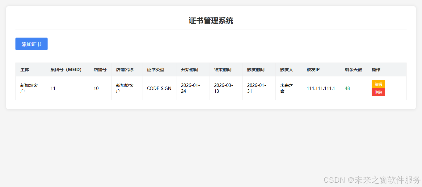 全流程可视化,风险可控:从证书添加、编辑到删除均记录操作日志,结合弹窗式表单与表格展示,实现"申请-存储-更新-注销"全流程可追溯,搭配前端验证逻辑(如有效期合法性校验),提前规避配置错误风险。