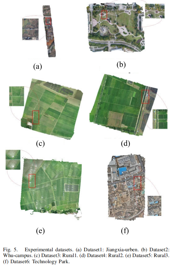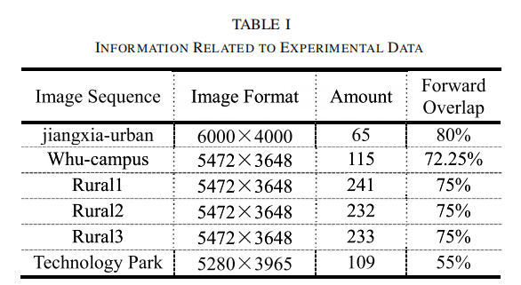 选取 6 组低重叠大尺寸无人机影像数据集,覆盖城市、校园、农田、科技园区等多种场景,详细信息如表 1 所示: