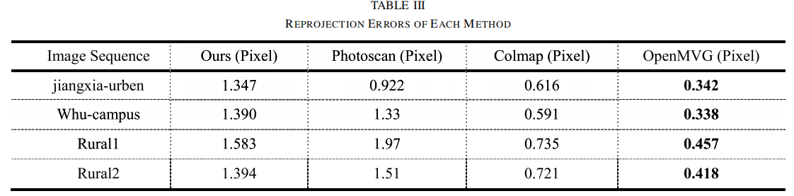 - 在 Rural1-2 等弱纹理场景中,RTO-LLI 的重投影误差优于 PhotoScan,体现了其匹配策略的鲁棒性。