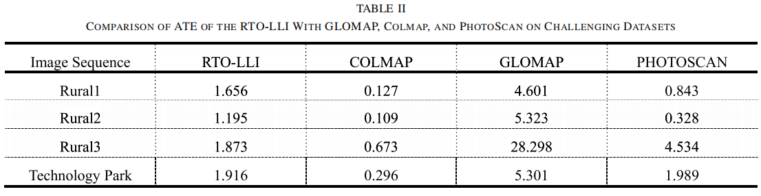 - 离线方法(如 Colmap)通过全局 BA 优化获得更高精度,但牺牲了实时性;RTO-LLI 作为在线方法,仅利用当前帧之前的序列数据,在低重叠场景下仍能保持可接受的精度;