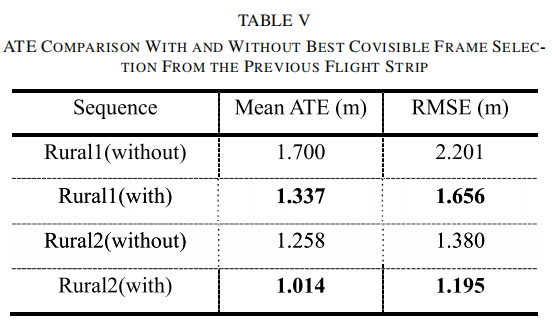 对比是否使用前航带最优共视帧的定位效果,结果如表 5 所示: