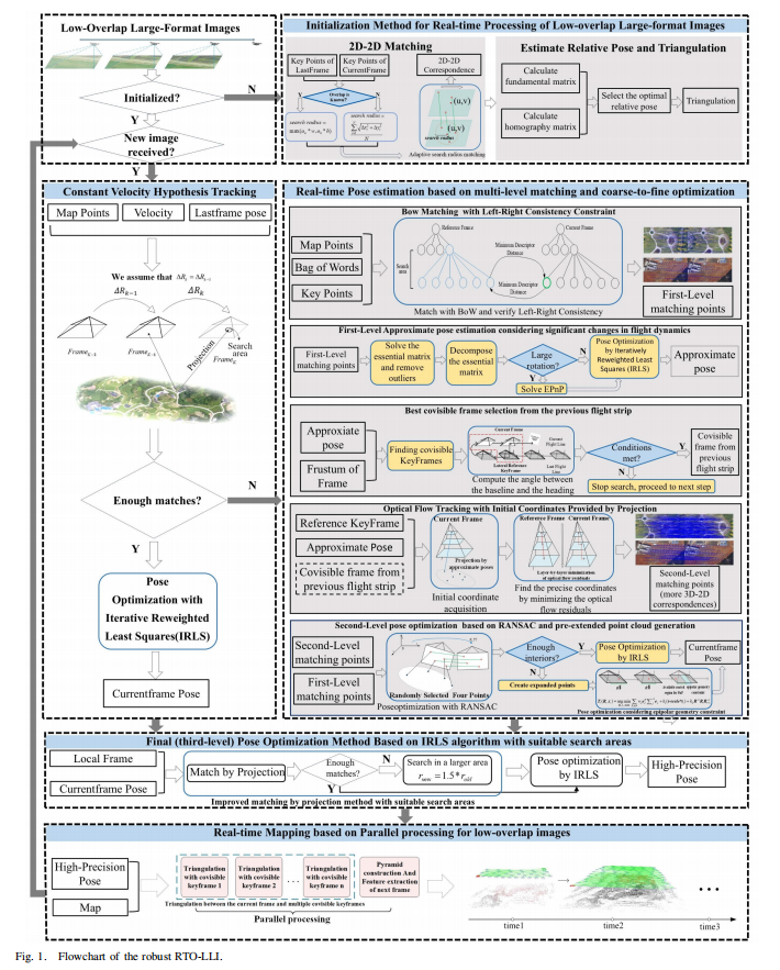 RTO-LLI 的核心框架如图 1 所示,以 "初始化 - 位姿跟踪 - 多级匹配与粗精优化 - 三次优化 - 并行建模" 的闭环流程为核心,针对低重叠大尺寸影像的技术痛点,在每个模块设计了针对性的数学模型与执行逻辑,以下对核心技术原理进行逐模块精细化解读。