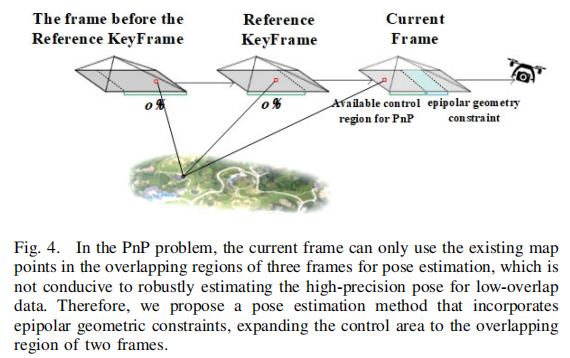 极线几何约束增强:针对低重叠场景下 3D-2D 对应点仅分布于三帧及以上重叠区域的问题,引入 2D-2D 约束扩展控制区域(如图 4 所示):