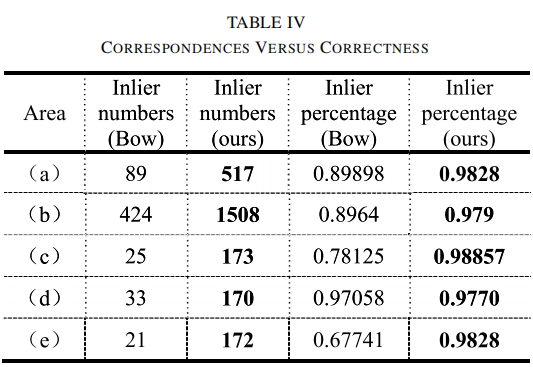 对比 RTO-LLI 的多级 3D-2D 匹配与传统 BoW 匹配,结果如表 4 所示: