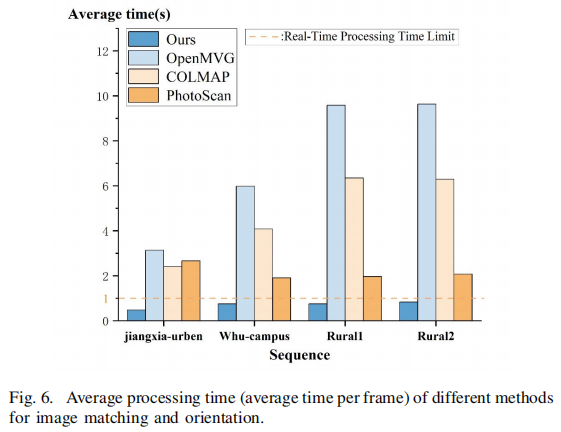 将 RTO-LLI 与传统离线 SfM 方法(PhotoScan、OpenMVG、Colmap)进行单帧处理时间对比,结果如图 5 所示: