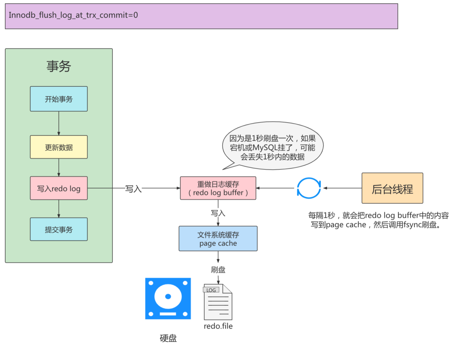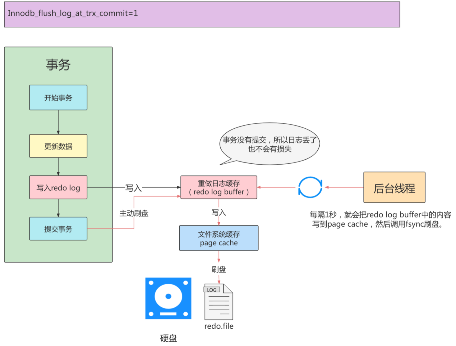 为1时,只要事务提交成功,redo log记录就一定在硬盘里,不会有任何数据丢失。