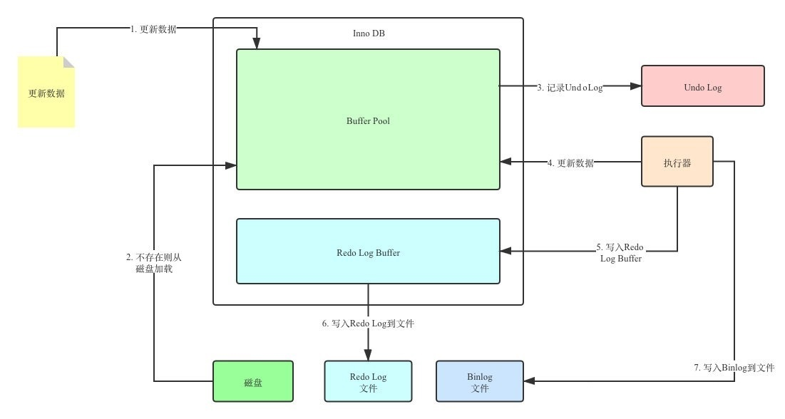 第1步:将要修改的数据从磁盘读取到内存中,具体就是buffer pool(图中的data buffer)中,这是一个mysql专门存数据的内存划分区域;然后修改buffer pool中的内容