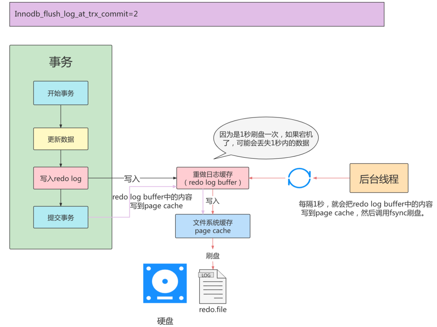 设置为2:表示每次事务提交时都只把 redo log buffer 内容写入page cache,不进行同步。由os自己决定什么时候同步到磁盘文件。show variables like 'innodb_flush_log_at_trx_commit'; mysql> show variables like 'innodb_flush_log_at_trx_commit'; +--------------------------------+-------+ | Variable_name | Value | +--------------------------------+-------+ | innodb_flush_log_at_trx_commit | 1 | +--------------------------------+-------+ 1 row in set (0.00 sec)