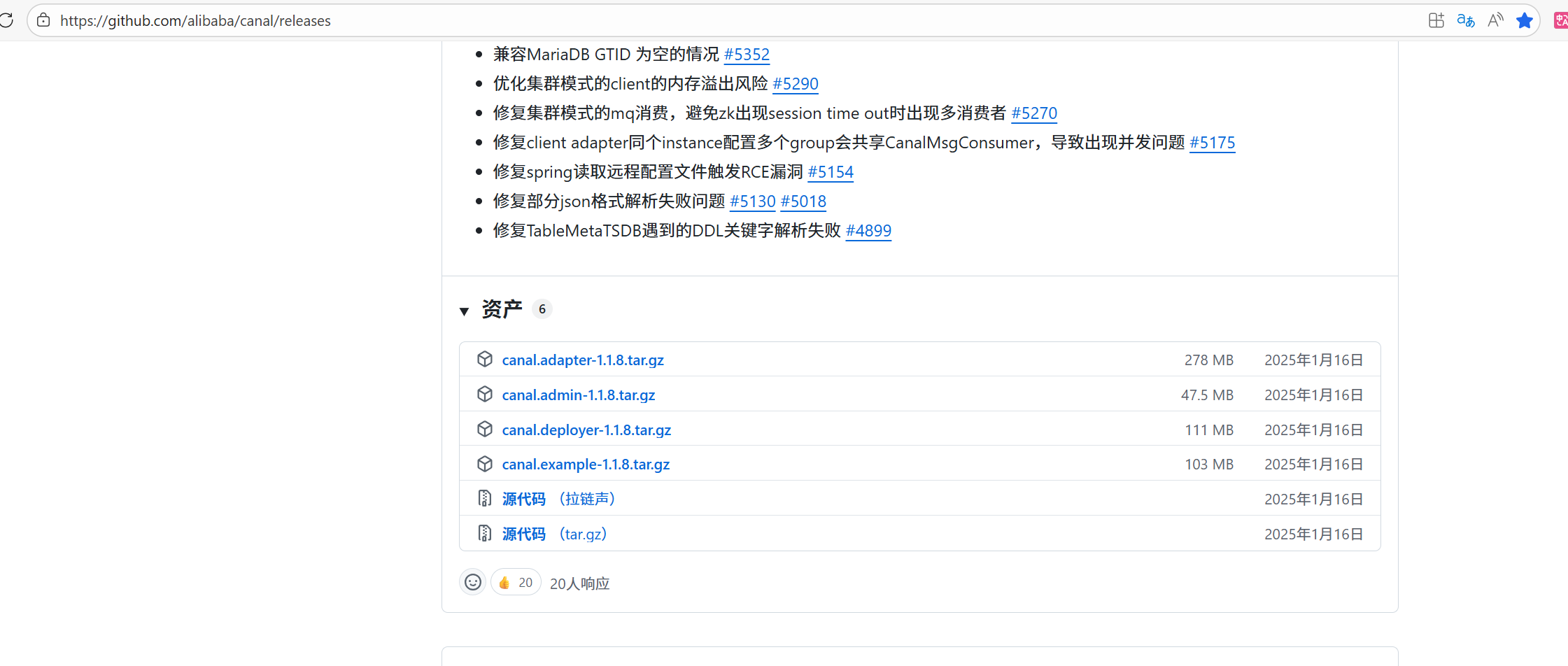 canal.deployer-1.1.8.tar.gz:Canal 核心服务端(必须);canal.adapter-1.1.8.tar.gz:数据同步适配器;canal.admin-1.1.8.tar.gz:Canal 管理控制台;canal.example-1.1.8.tar.gz:示例代码包;