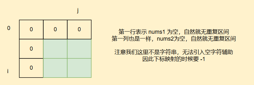 为了避免和原字符错位的下标映射,我们可以再两个字符串开头加入空白字符,让字符串下标和dp数组下标对齐,方便映射填表