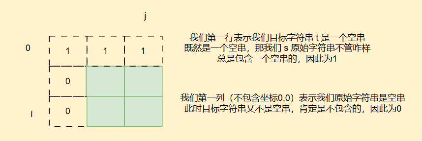 好我们再来看初始化,子序列是包含空串的,因此空串也要考虑