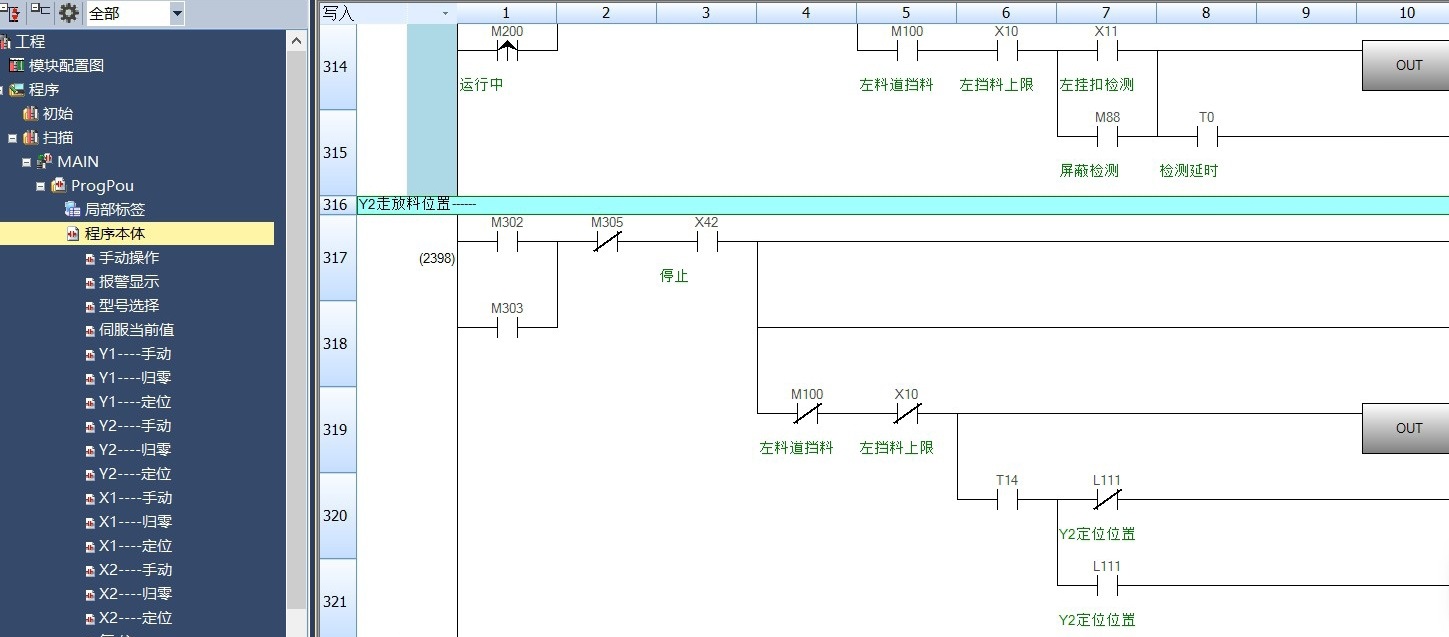 FX5u控制4个伺服,一个完整的项目 程序用 标签分层,说明了定位控制中的公共参数设定、回原点、JOG手动、绝对定位、相对定位、控制等部分,威纶程序报警界面.多个机种选择,手动,自动,暂停,包括有: 1、plc程序一份 2、设备说明书一份 3、电路图一份 4.威纶屏程序一份 5.io表一份 6.电气清单一份