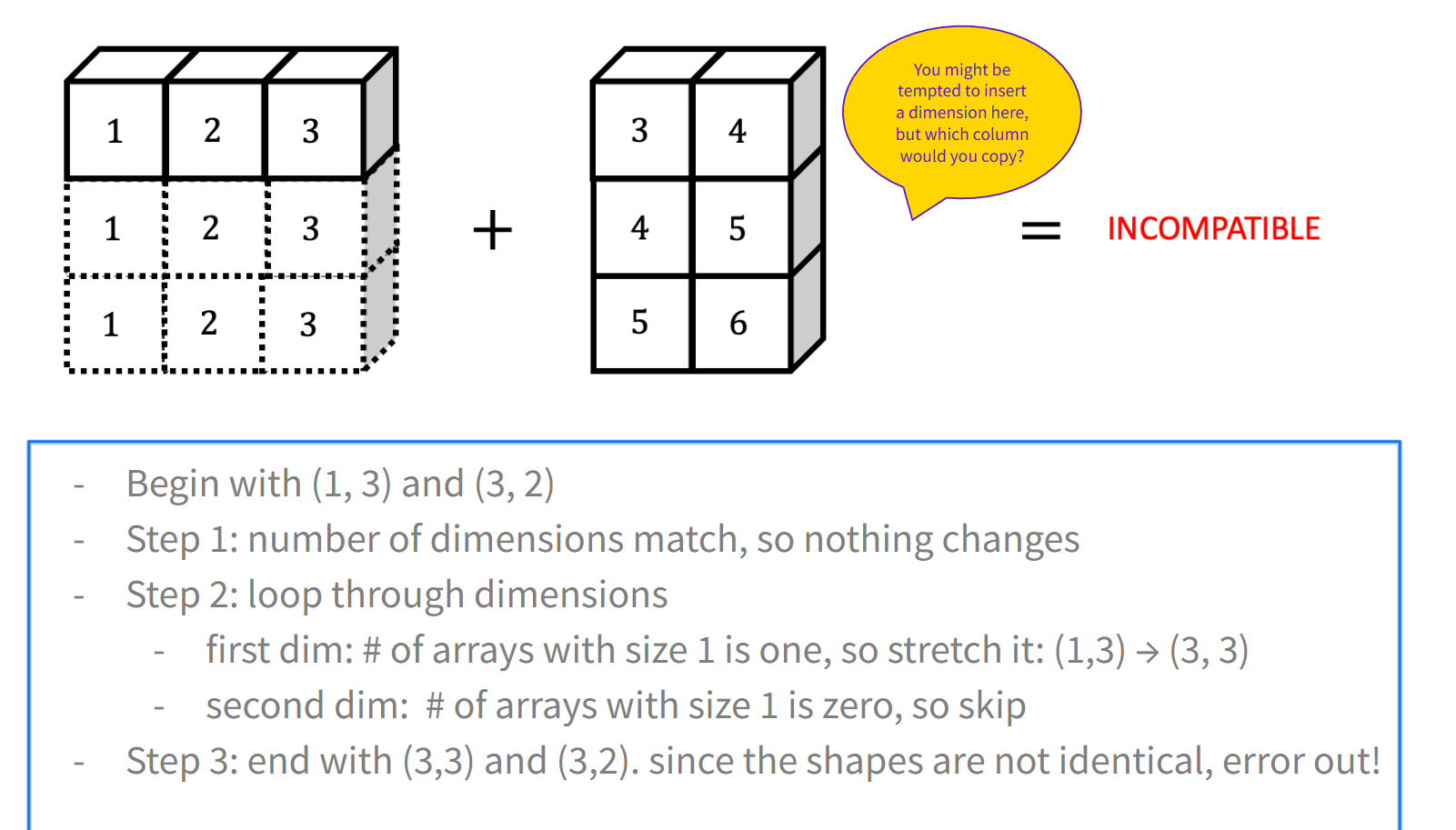 意思是:如果在某个维度上两个大小不相等 ,而且都不等于 1,那就没法广播,运算直接报错;例如 (2,n) 和 (3,n) 在第一维上既不相等又都不为 1,因此是非法的。