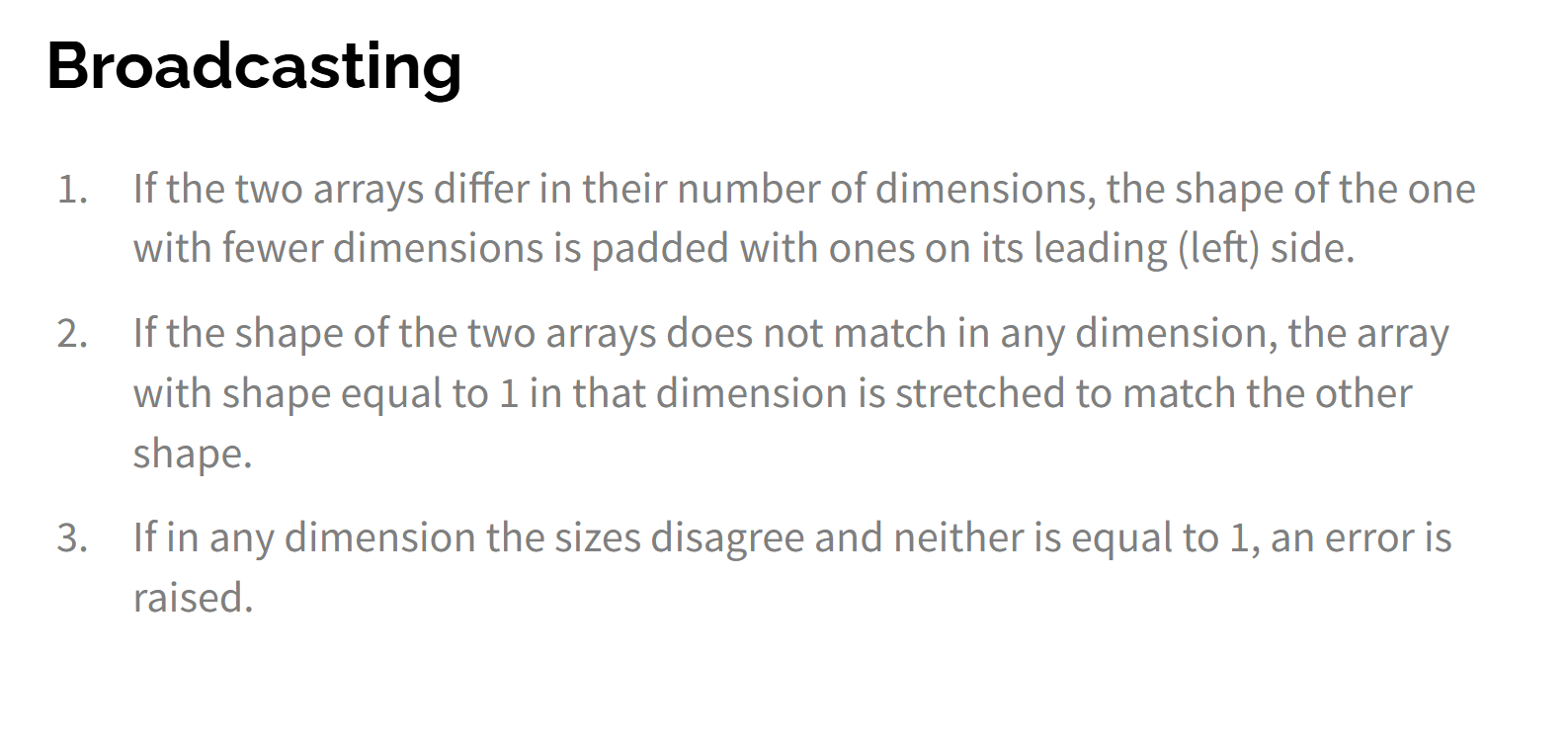 If the two arrays differ in their number of dimensions, the shape of the one with fewer dimensions is padded with ones on its leading (left) side.