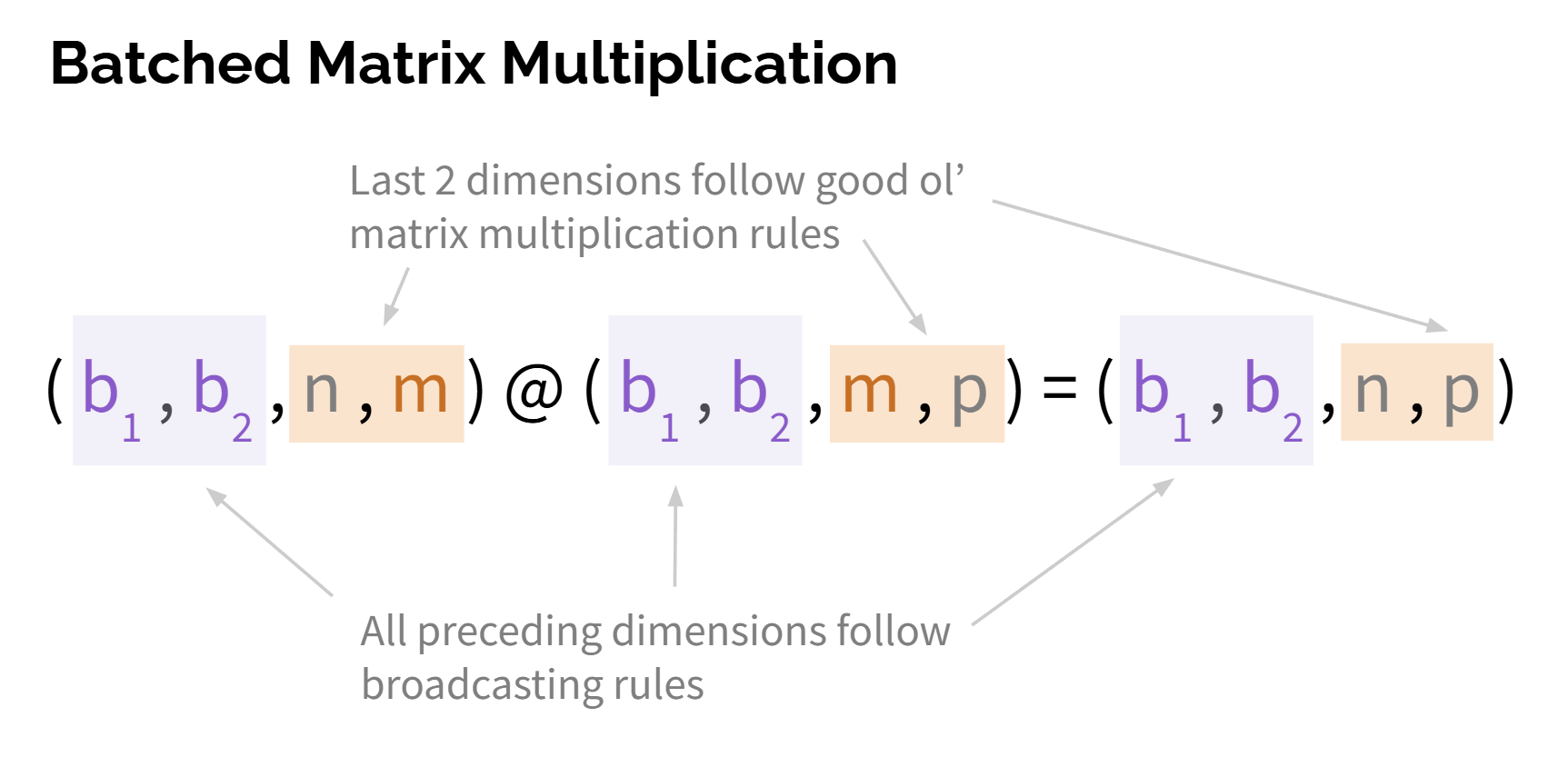 图中前面的 (b1,b2b_1, b_2b1,b2) 表示 批次维度(batch dimensions) ,也就是"有多少个矩阵同时在做乘法"。在 batched matrix multiplication 中,最后两维 (n,m) 与 (m,p) 按普通矩阵乘法规则相乘,而前面所有维度 (这里是 b1,b2b_1, b_2b1,b2)并不参与数值运算,只用于索引不同的矩阵批次;它们必须相等或满足广播规则,结果中这些维度会被原样保留下来.