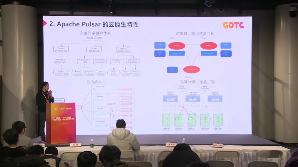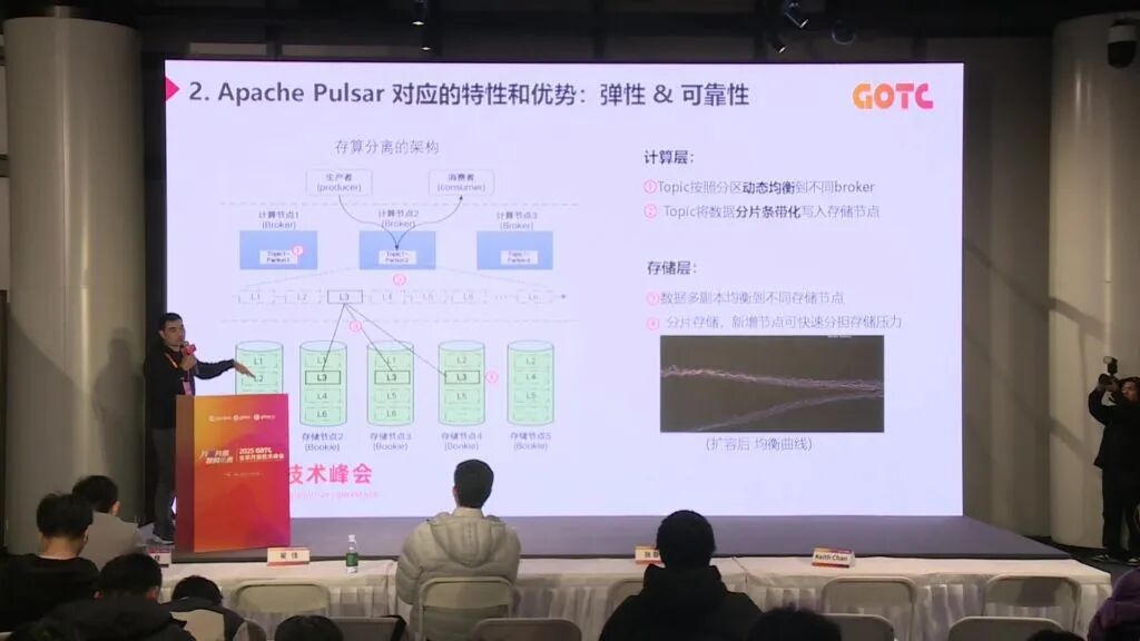 灵活扩缩容实例:新节点加入后自动从老节点接管部分流量,最终达到均衡,整个过程无需人工干预。相比 Kafka 等需要数据搬迁的架构,Pulsar 的存算分离能更快响应流量洪峰。