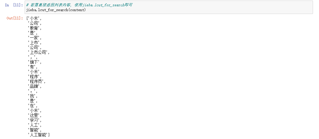 # 若需直接返回列表内容, 使用jieba.lcut即可